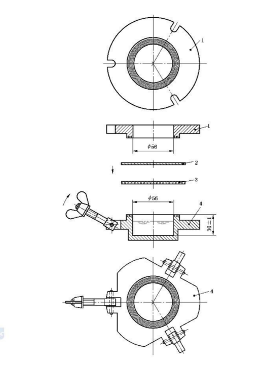 測試裝置為一個由頂蓋和底座組成的吸水汽性測試盤,開口直徑為56mm,深(30士1)mm頂蓋和底座之間應(yīng)放置橡皮或金屬密封墊幫助夾緊試樣。