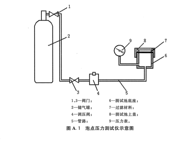 將經(jīng)A.1預(yù)處理過(guò)的試樣置于測(cè)試池底座上,試樣有效測(cè)試直徑應(yīng)不小于35mm,旋緊測(cè)試池上蓋,在測(cè)試池上蓋中加入試驗(yàn)用試劑,用氮?dú)馍龎簻y(cè)試,至測(cè)試池中出現(xiàn)第一個(gè)氣泡并連續(xù)出泡時(shí)立即停止升壓,讀取此時(shí)的壓力值,即為泡點(diǎn)壓力。泡點(diǎn)壓力(適用于標(biāo)稱孔徑小于2um的膜材)。