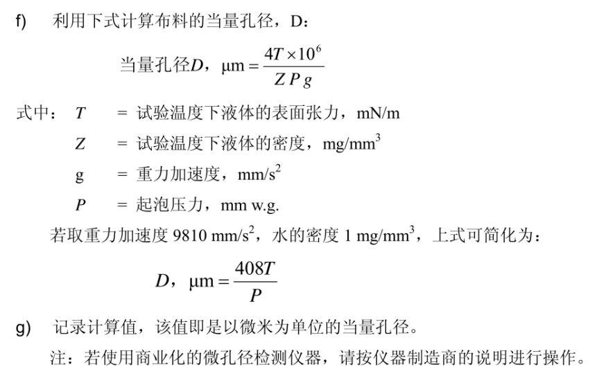 將布料用一個(gè)夾具夾緊。然后,用己知表面張力的適當(dāng)液體浸濕布料,并對(duì)布料施加氣壓。觀察布料并測(cè)量克服液體表面張力所需的氣壓,可以確定起泡點(diǎn)壓力。然后,利用這個(gè)起泡壓力來(lái)確定布料的相對(duì)孔徑。有關(guān)本試驗(yàn)的限制的討論參見(jiàn)英國(guó)標(biāo)準(zhǔn)BS3321和ARP901。有關(guān)利用微孔測(cè)試儀測(cè)定孔徑的方法參見(jiàn)ASTME1294。