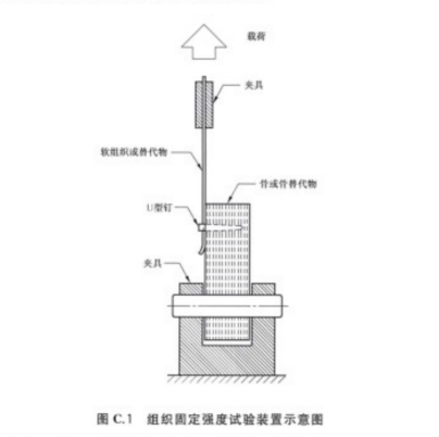 使用單個(gè)或多個(gè)U型釘,將軟組織或替代物固定到骨或骨替代物上。以與釘腿平面垂直的方向?qū)浗M織或替代物施加拉力,直至軟組織或替代物發(fā)生破裂或撕裂,或者U型釘固定失效。可以在常溫環(huán)境條件下或者在水溶液或生理溶液中(室溫或37℃)采用本試驗(yàn)方法進(jìn)行試驗(yàn)。
