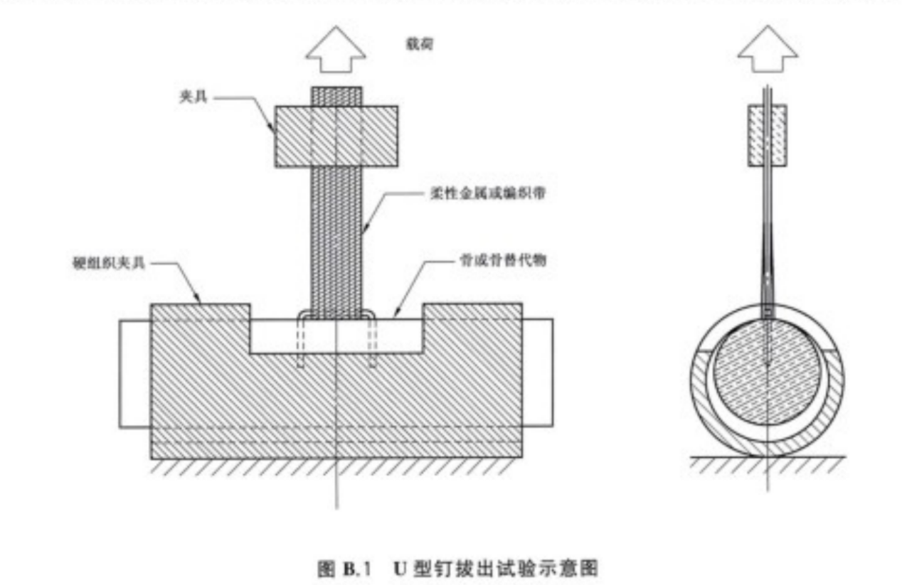 1 硬組織夾具--專門用于牢國抓取骨、骨段或骨替代物的夾具,對金屬或編織帶施加張力時。可以使材料對U型釘固定部位的影響最小化。此類夾具應能適應不同幾何形狀的骨,并能在試驗期間對骨或骨替代物進行正確定向和對齊。