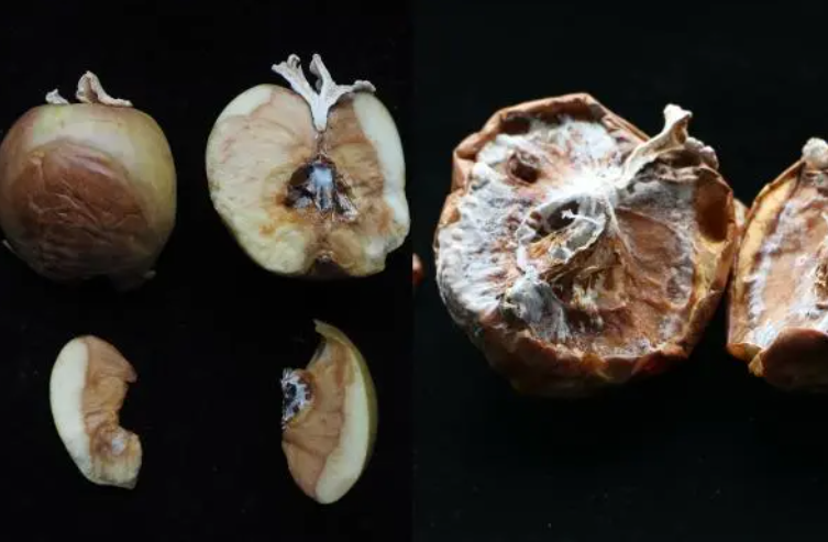 7月10日(左邊)和7月11日(右邊)蘋果上的白參菌絲生長對(duì)比。許容聚博士供圖(圖2)