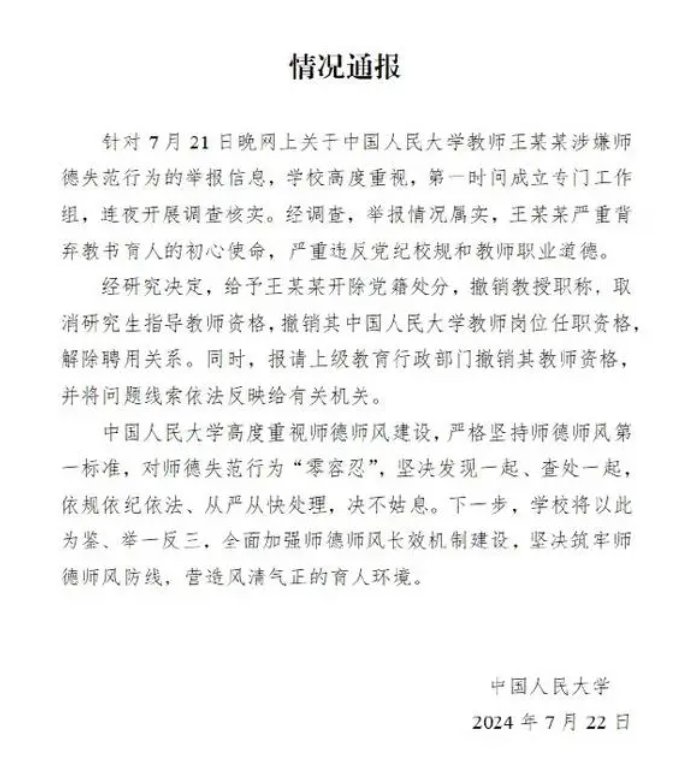 7月22日,中國(guó)人民大學(xué)發(fā)布情況通報(bào)稱(chēng),針對(duì)7月21日晚網(wǎng)上關(guān)于中國(guó)人民大學(xué)教師王某某涉嫌師德失范行為的舉報(bào)信息,學(xué)校高度重視,第一時(shí)間成立專(zhuān)門(mén)工作組,連夜開(kāi)展調(diào)查核實(shí)。經(jīng)調(diào)查,舉報(bào)情況屬實(shí),王某某嚴(yán)重背棄教書(shū)育人的初心使命,嚴(yán)重違反黨紀(jì)校規(guī)和教師職業(yè)道德。