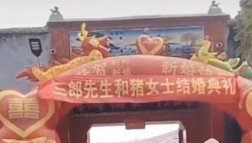 據網絡視頻顯示,某婚禮現(xiàn)場,有嗩吶接送,不少村民圍觀拍攝,充氣拱門上卻寫著“三郎先生和豬女士結婚典禮”。